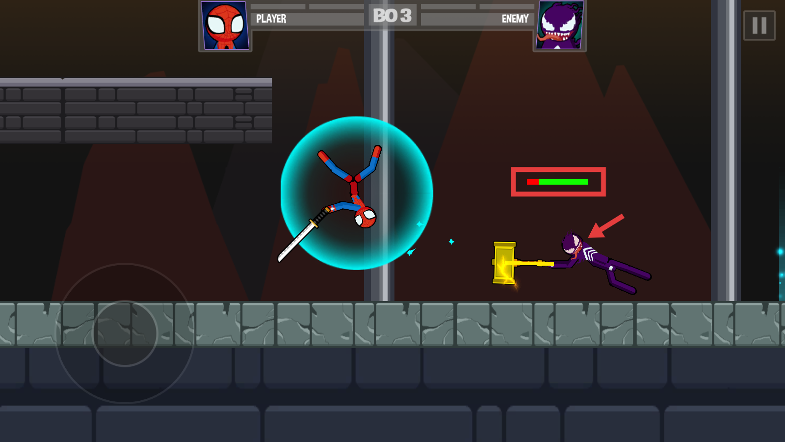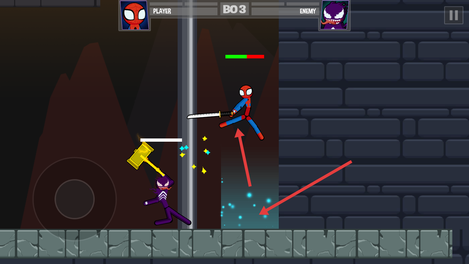 1、战斗开局通过【虚拟摇杆】操控角色,紧盯敌人【持锤】动作,预判攻击轨迹,灵活调整站位。