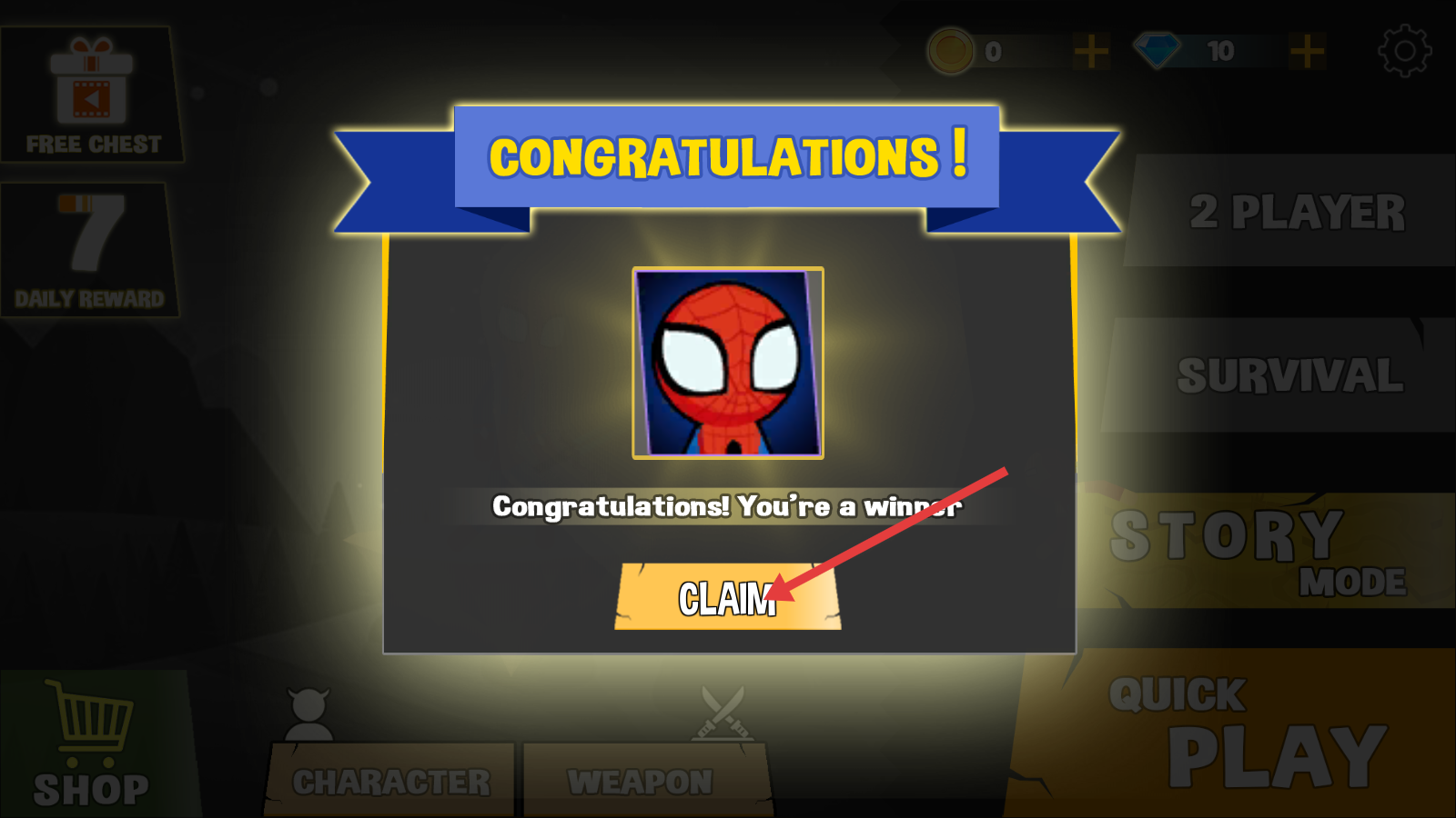4、胜利后点击【CLAIM】领取奖励,积累资源解锁角色或武器,助力后续关卡挑战。