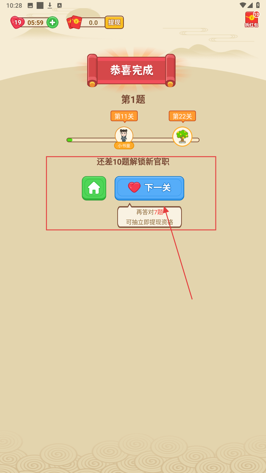 4、在【恭喜完成】页面,点击【下一关】即可继续挑战。