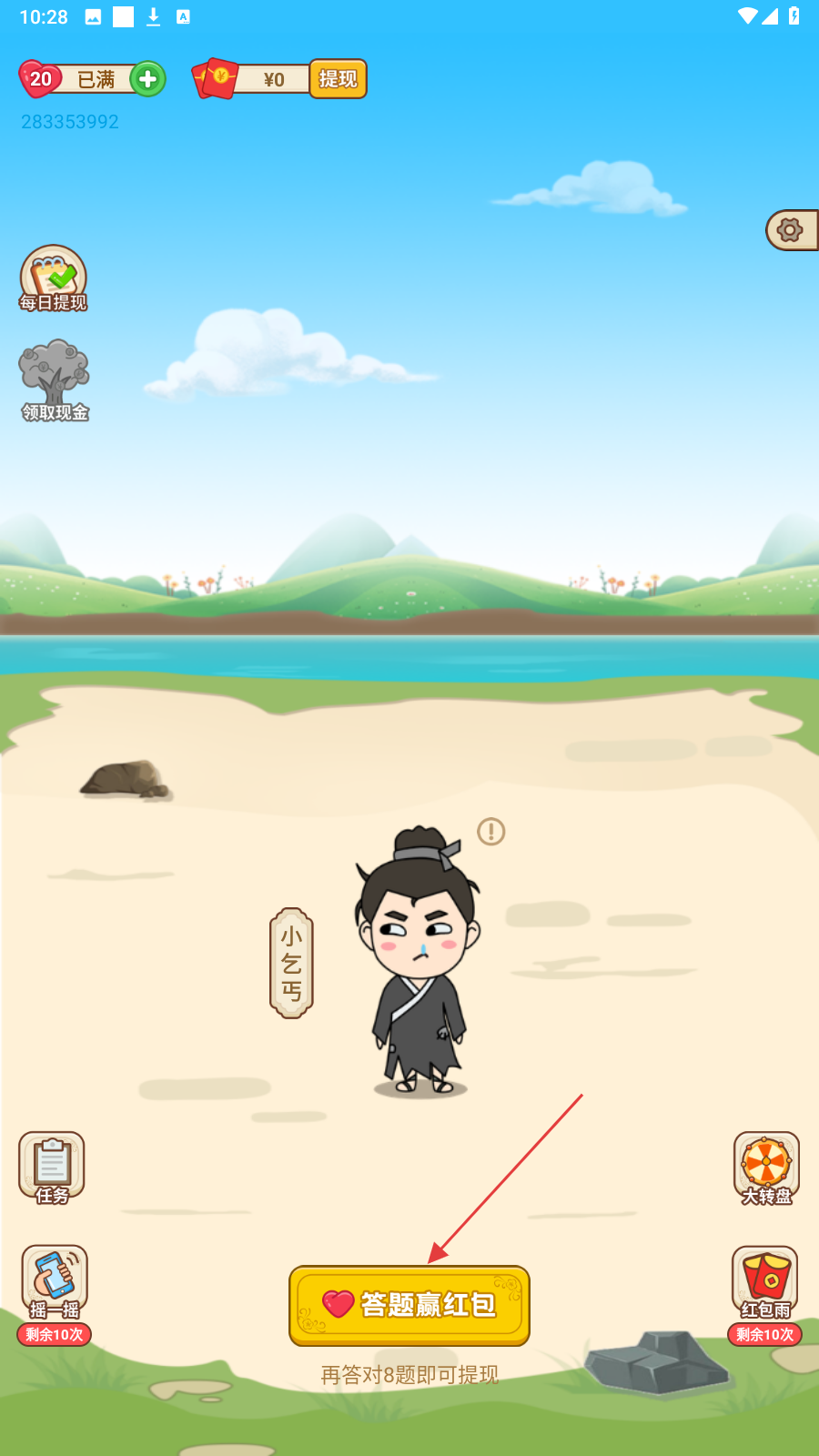 1、打开应用,在主界面点击【答题赢红包】按钮,进入答题页面。