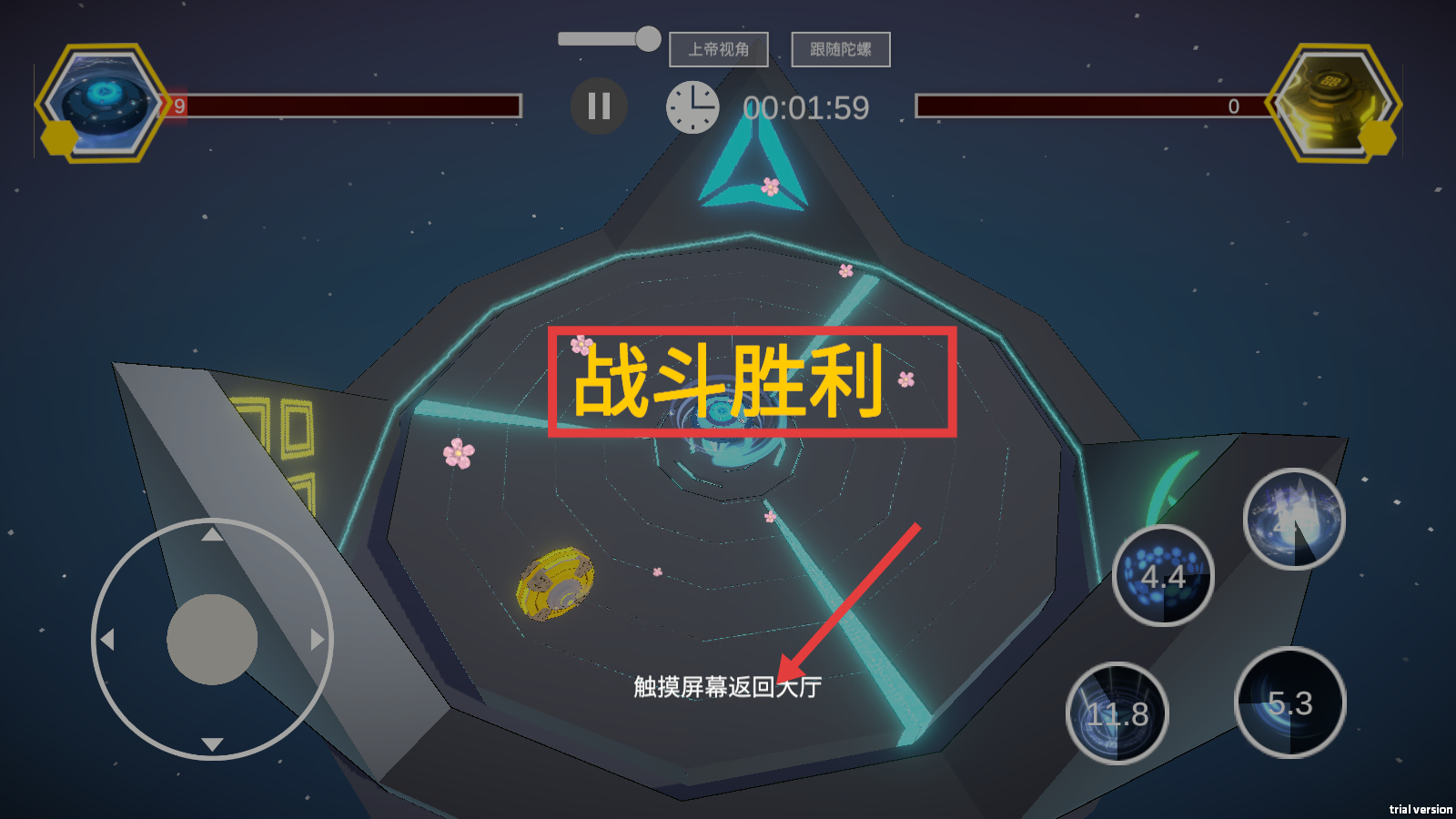 4、达成【战斗胜利】后,触摸屏幕返回大厅,为下一轮对战做准备。