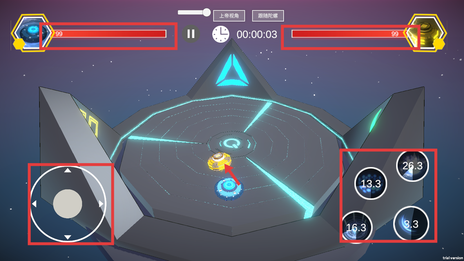 3、战斗时用左侧【摇杆】操控陀螺,点击右侧技能,消耗敌方陀螺的【血量条】。