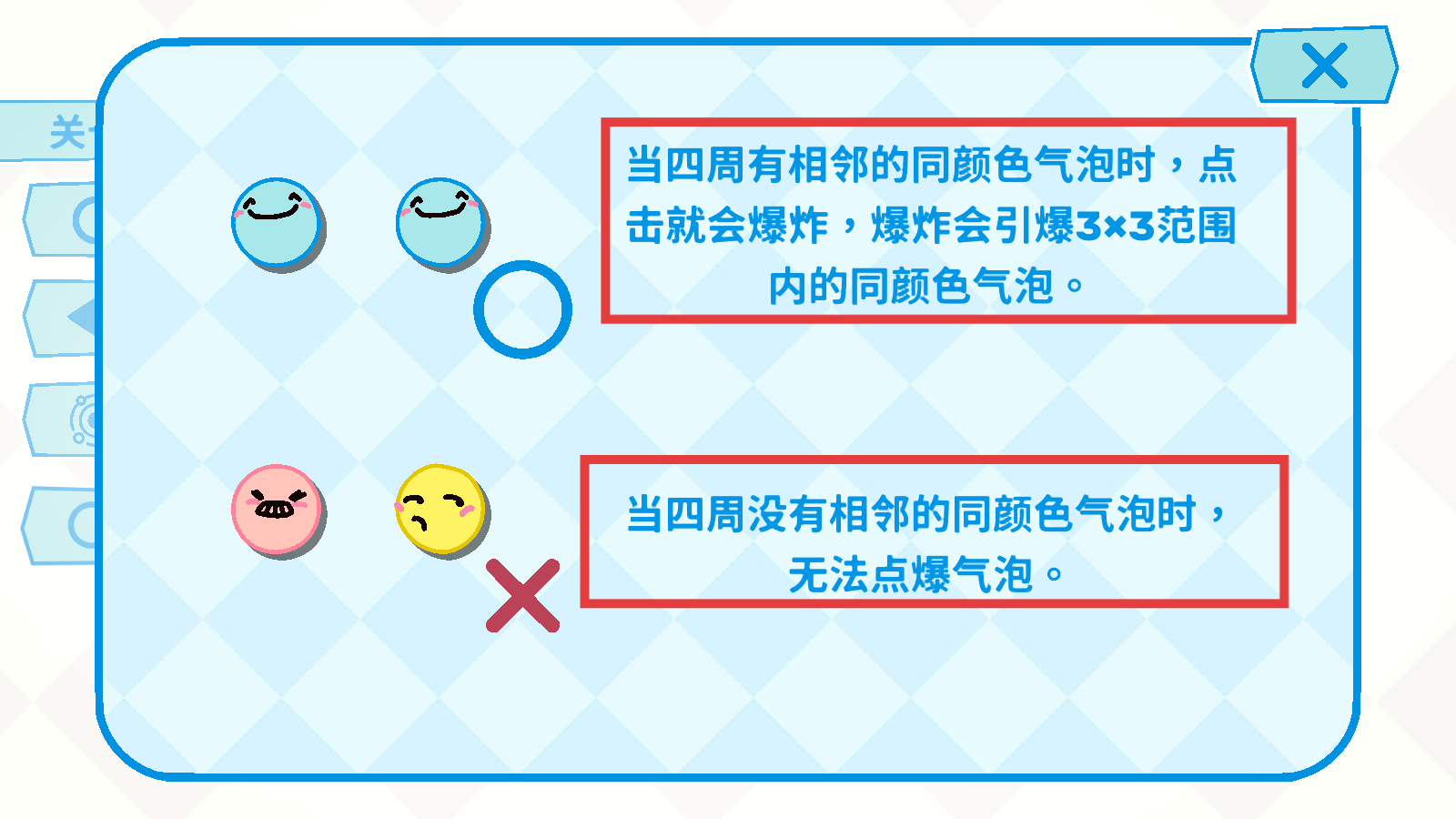 2、牢记规则仅当气泡有相邻同色时,点击可引爆(触发3×3范围连锁爆炸),无相邻同色则无法点击。