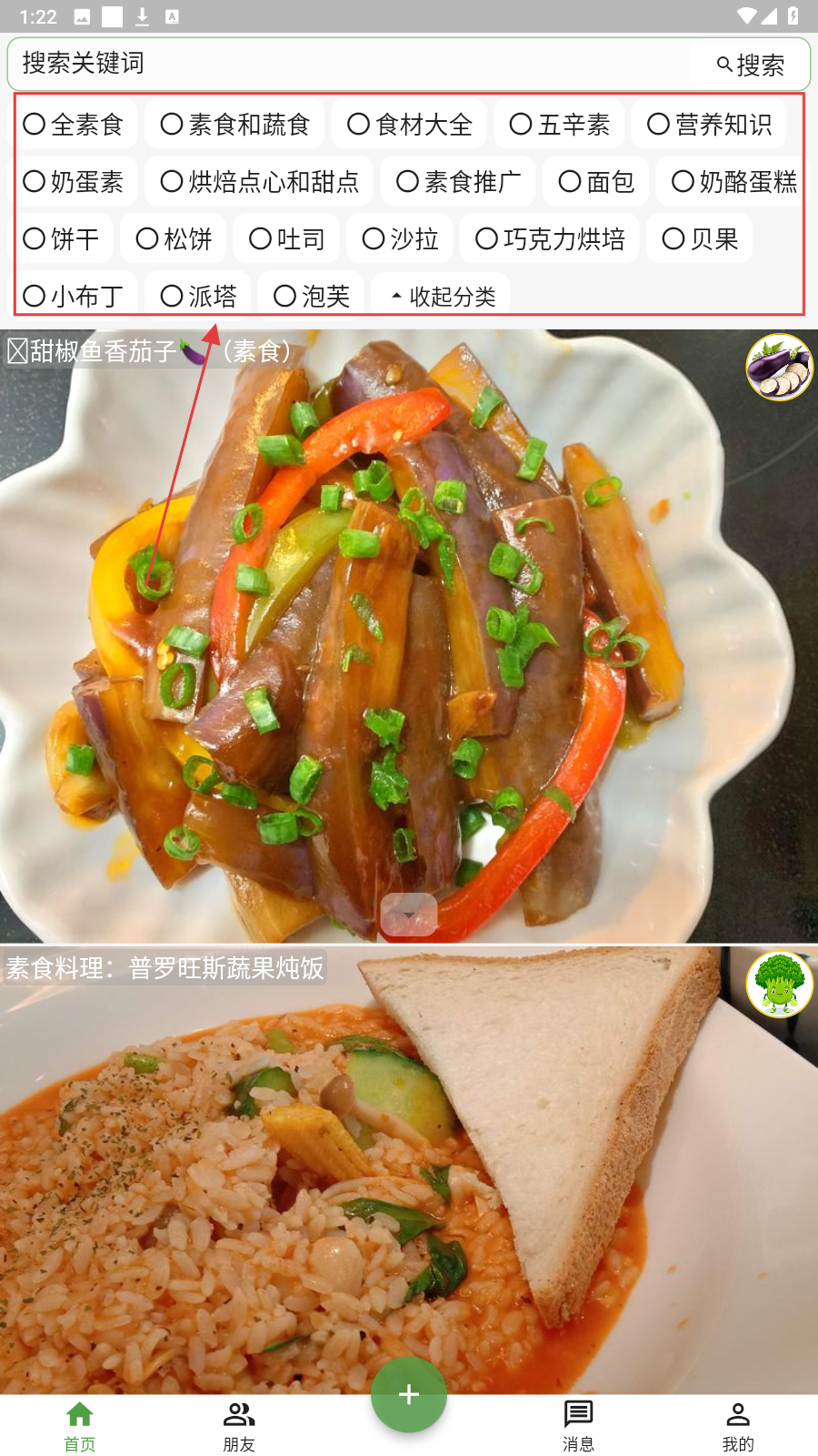 2、在首页用搜索关键词或分类筛选,如选【派塔】等标签,找对应素食内容。