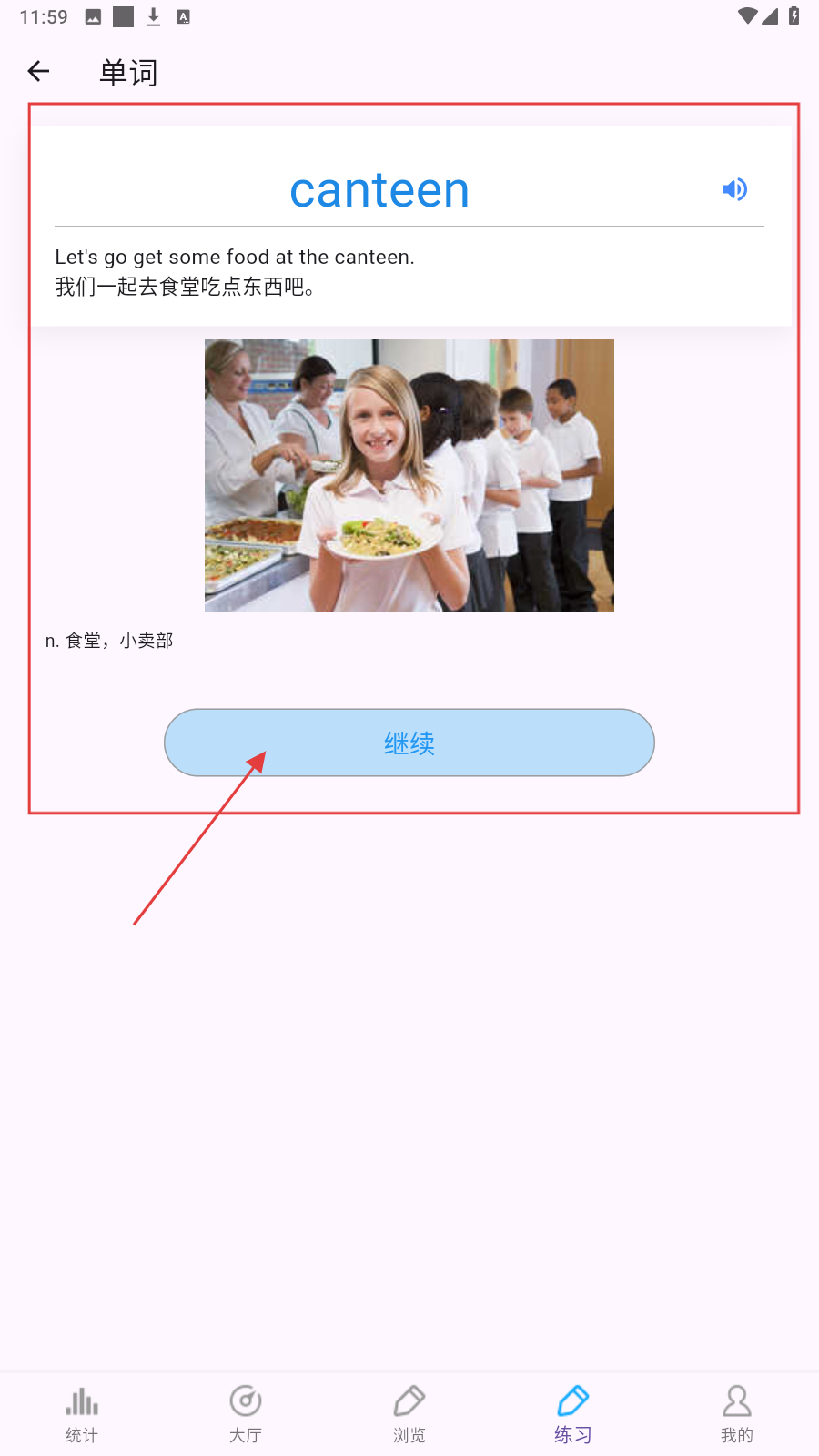 2、答题后进入单词详情,查看例句、释义,点【继续】推进学习流程。