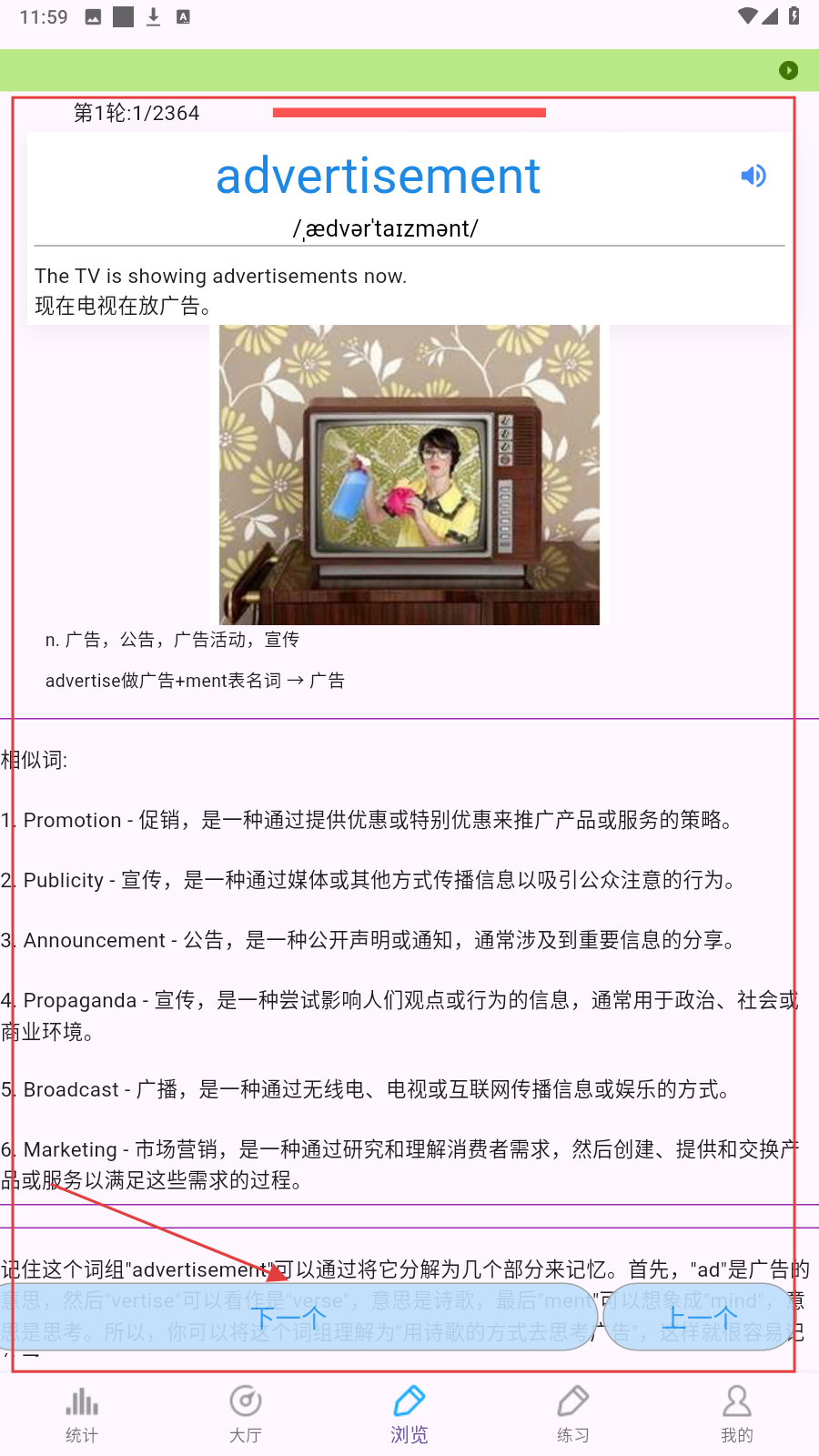 3、进入【浏览】页,借助图片、词源、相似词等,深度理解单词,强化记忆。如若切换点击【下一个】按钮。