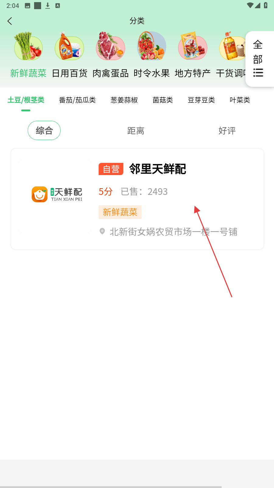 3、进入分类后,选商家,如【邻里天鲜配】,查看在售商品。