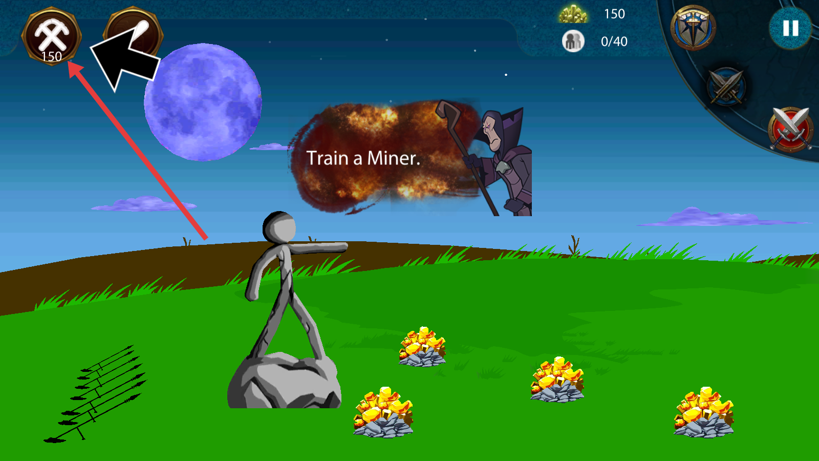 2、点击左上角【锄头-150】图标,训练矿工,解锁资源采集,为防御积攒金币。