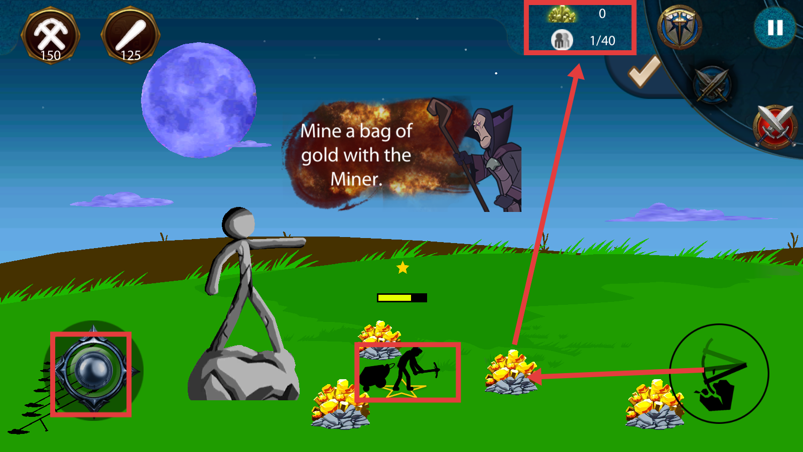 4、布置弓箭手,瞄准【红色血条】敌人,拦截进攻,守护金矿与已训兵种,推进关卡。