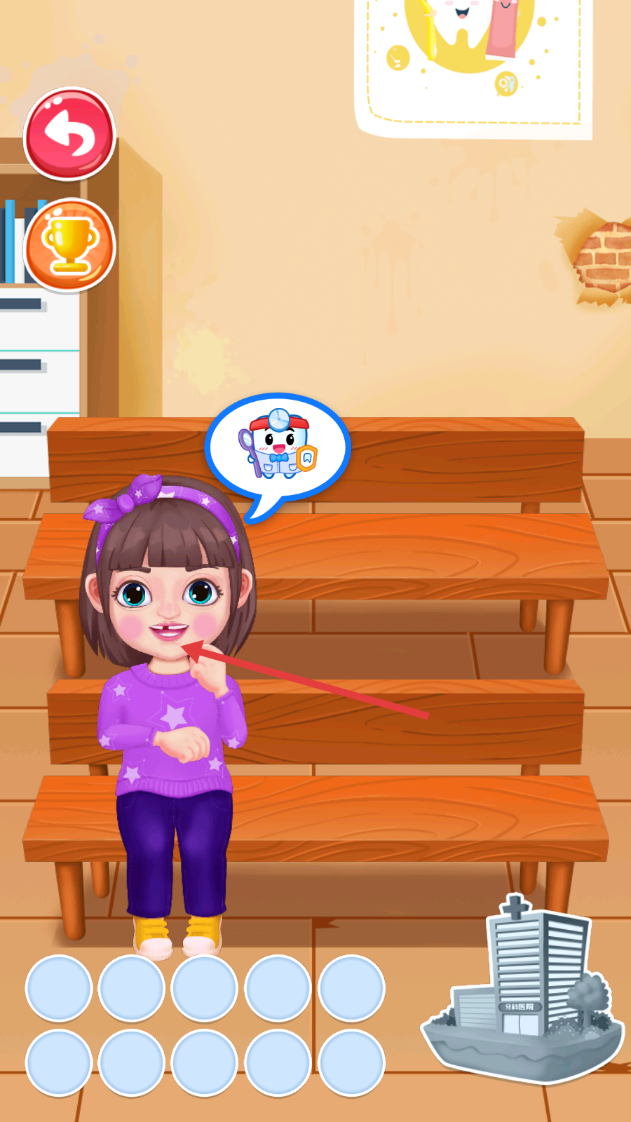 1、留意女孩气泡提示,点击右下角【牙科医院】图标,开启口腔治疗,填充底部空位推进流程。