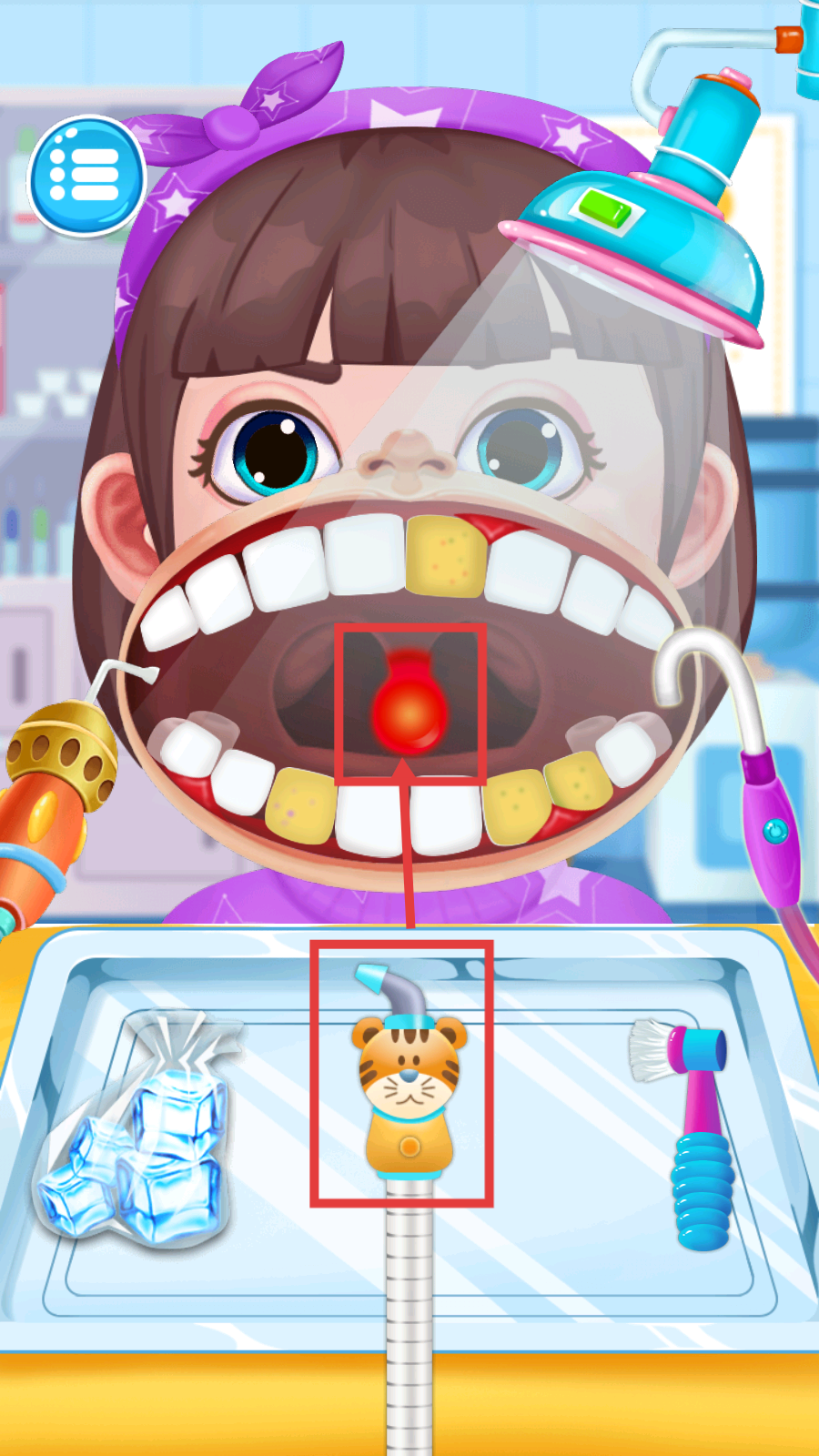 3、点击托盘【冰块】道具,修复牙齿【黄色斑块-红色患处】,清除口腔问题,提升治疗进度。