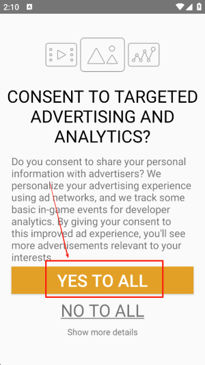 1、同意广告和分析:在游戏开始前,点击“YES TO ALL”同意分享个人信息,以获得个性化广告体验。
