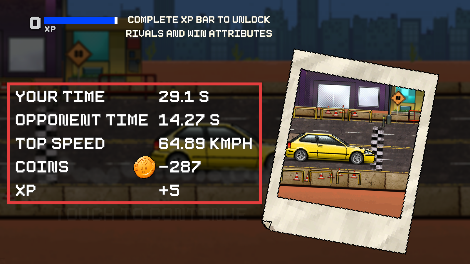 4、赛后查看结算:自身用时29.1S、对手14.27S,最高速64.89KM/H,金币-287、XP 5,复盘竞速表现。