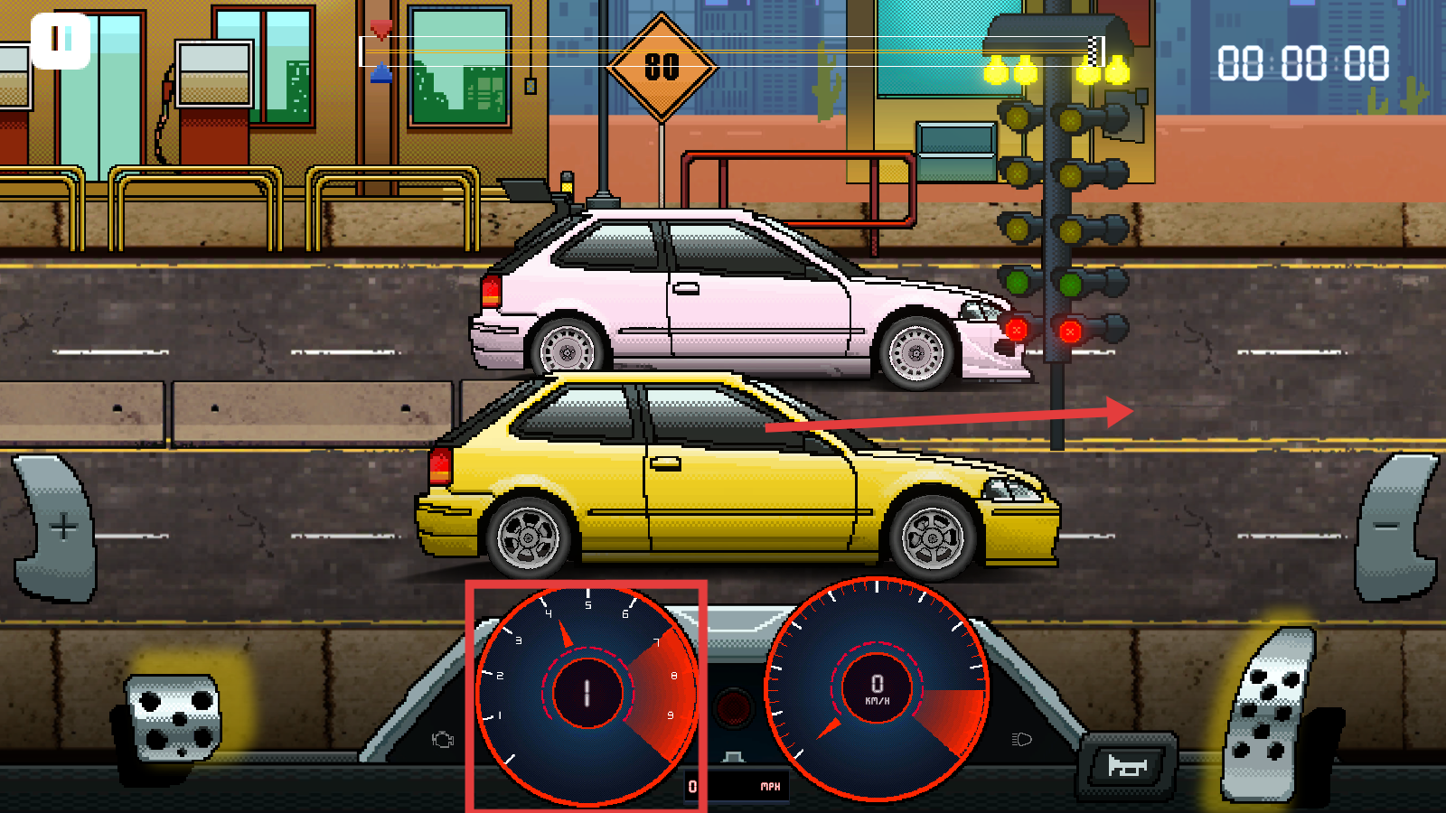 2、比赛内左侧【骰子图标】控换挡,右侧【踏板】调油门,关注中间转速表,预判动力输出节奏。