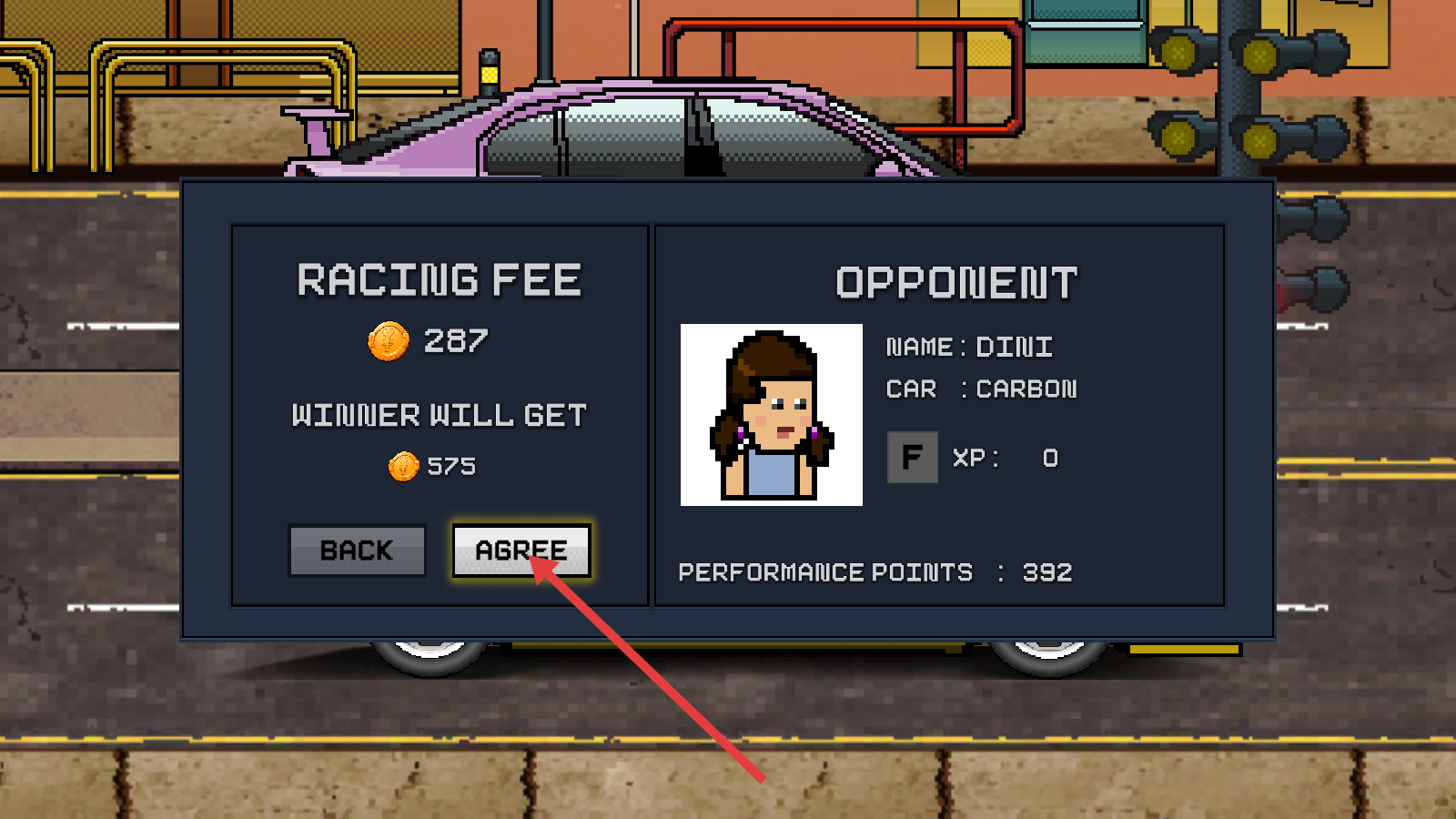 1、赛前界面点击【AGREE】,确认参赛:支付287金币,挑战对手DINI(座驾CARBON),获胜可获575金币。