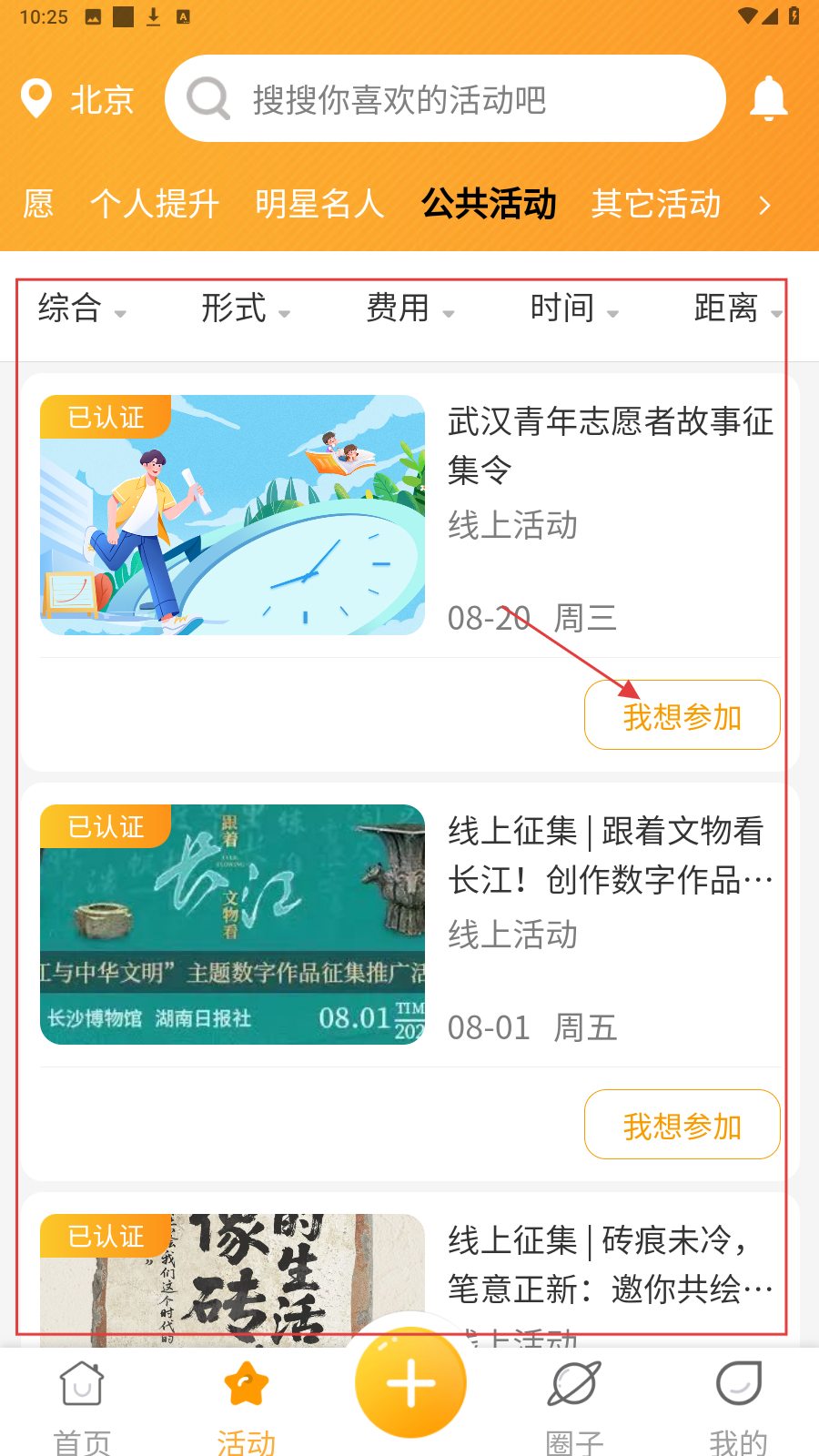2、找到想参加活动(如武汉青年志愿者故事征集令),点【我想参加】。
