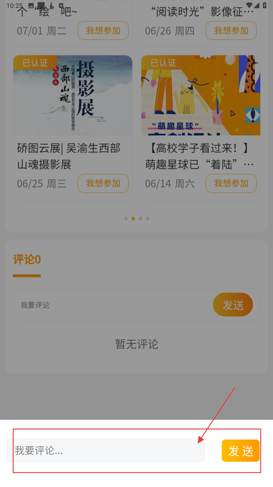 4、在评论区输入内容,点【发送】参与讨论,交流活动体验。