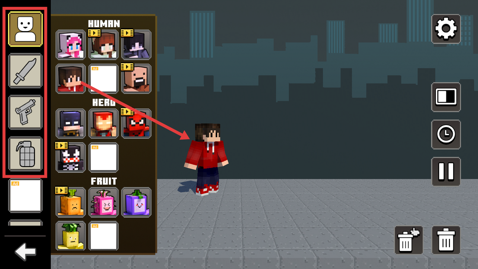 1、角色管理操作:通过添加菠萝人角色并装备武器,控制动作进行模拟战斗,提升能力应对不同挑战。
