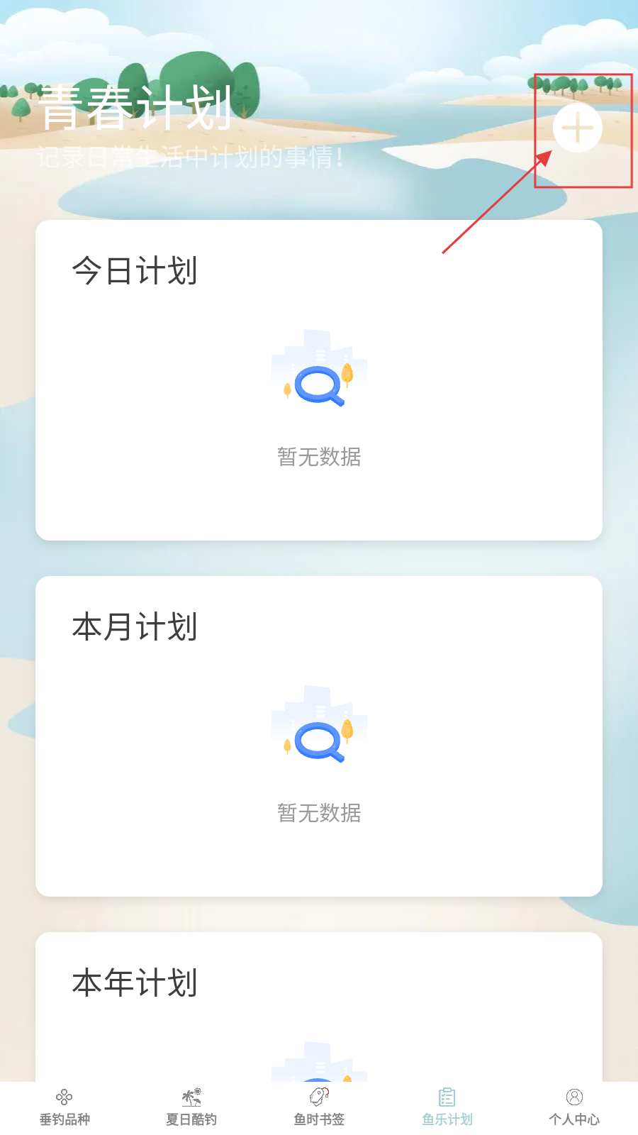 3、切鱼乐计划页,点右上角【 】,开启添加钓鱼计划流程。