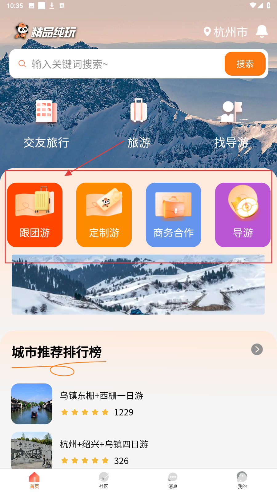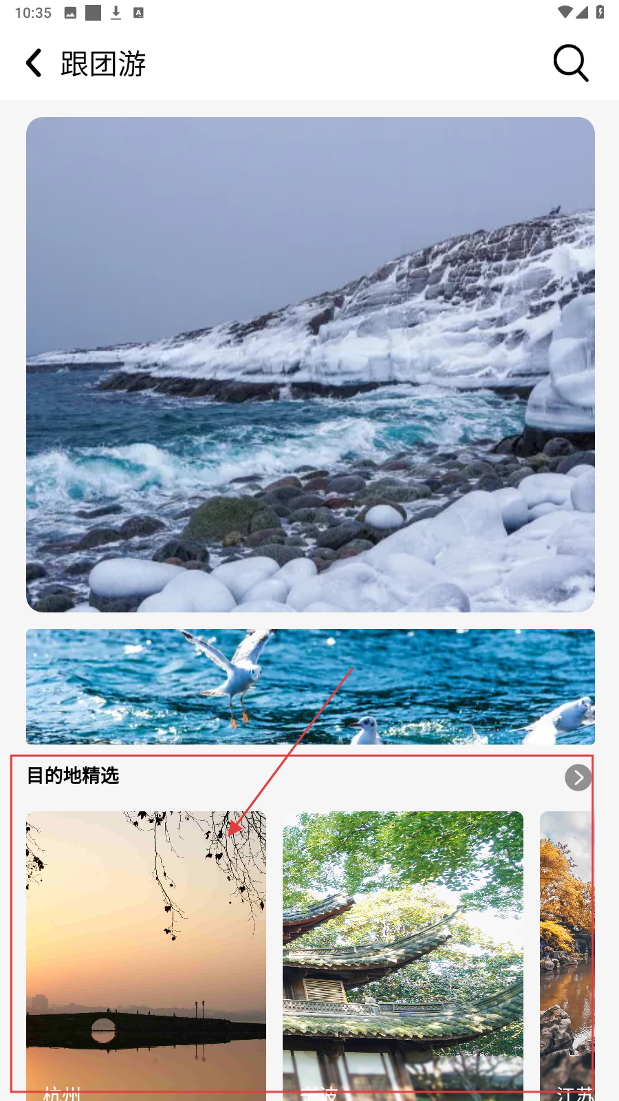 2、在跟团游页面,点【目的地精选-杭州】,查看杭州相关跟团线路。