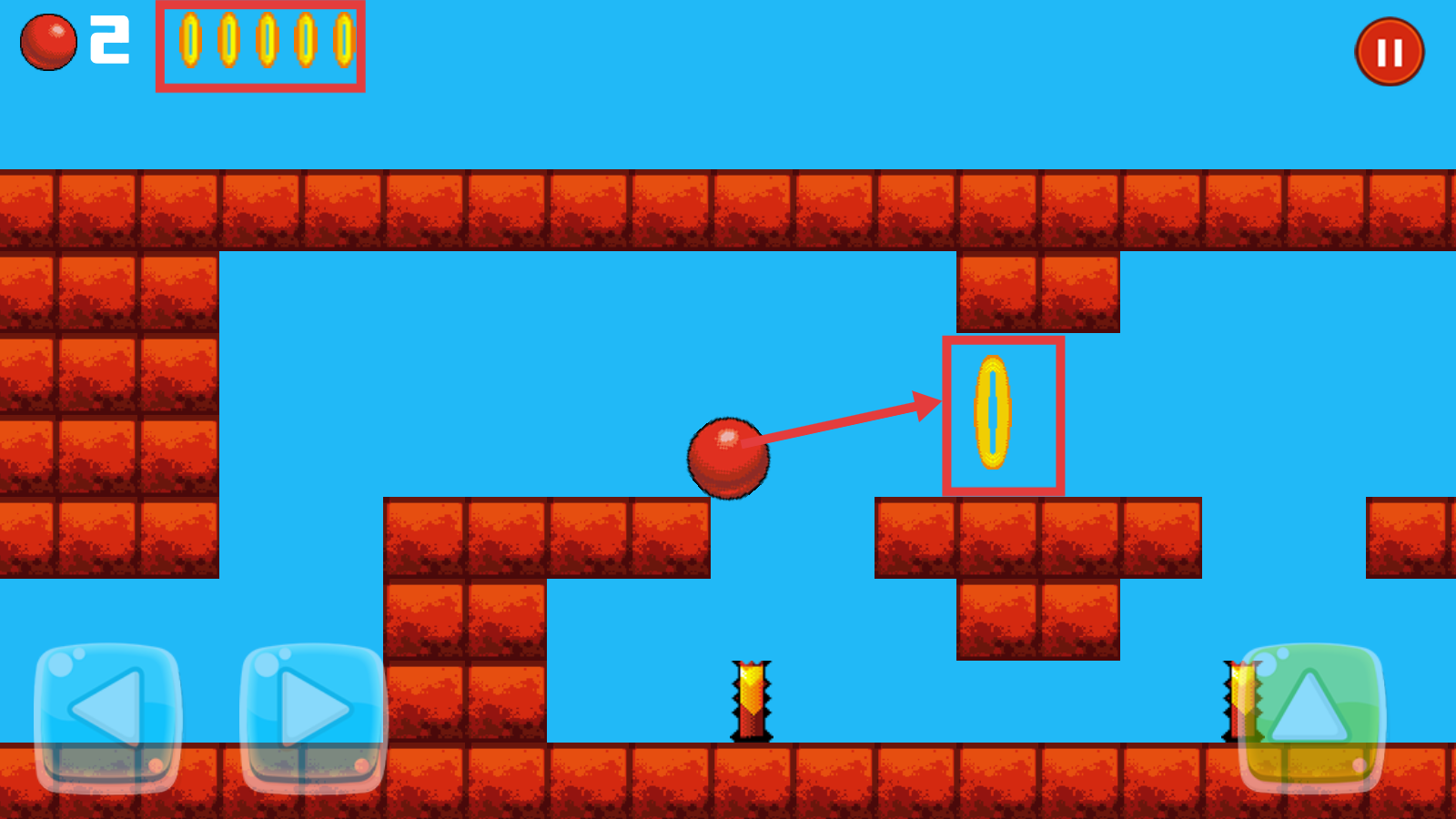 2、挑战内左侧【←→】按钮控红球移动,右侧【△】键触发跳跃,优先收集路径金色圆环道具。