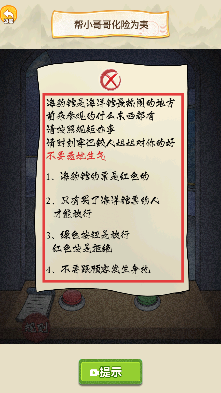 3、牢记海豹馆规则,红票放行、绿钮通过,遵循条款,避免因违规触发失败结局。