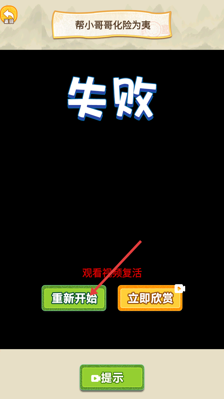 4、若显示【失败】,点击【重新开始】,依据规则调整检票操作,重试挑战直至通关。