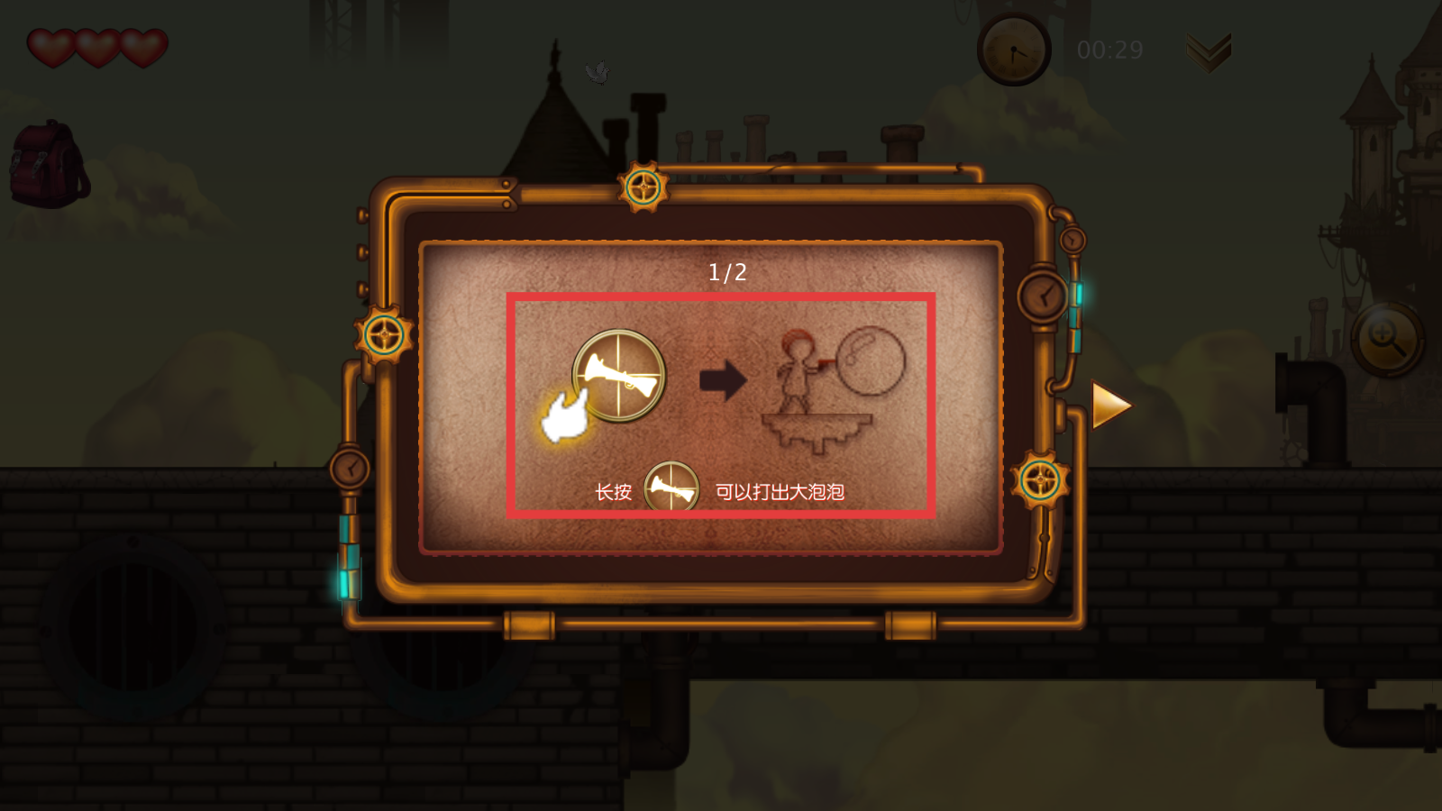 3、触发教程,长按右侧【喇叭图标】,释放大泡泡,掌握该技能应对后续关卡挑战。