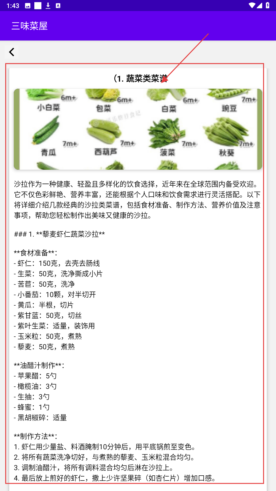 3、选【蔬菜类菜谱】,获取沙拉等菜品的食材、做法详情。