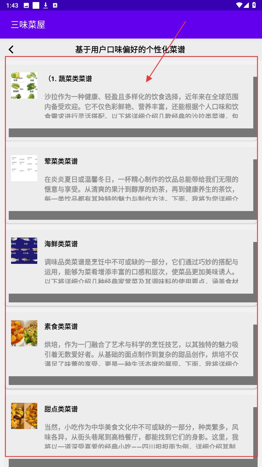 2、点【基于用户口味偏好的个性化菜谱】,查看蔬菜/荤菜等细分品类。