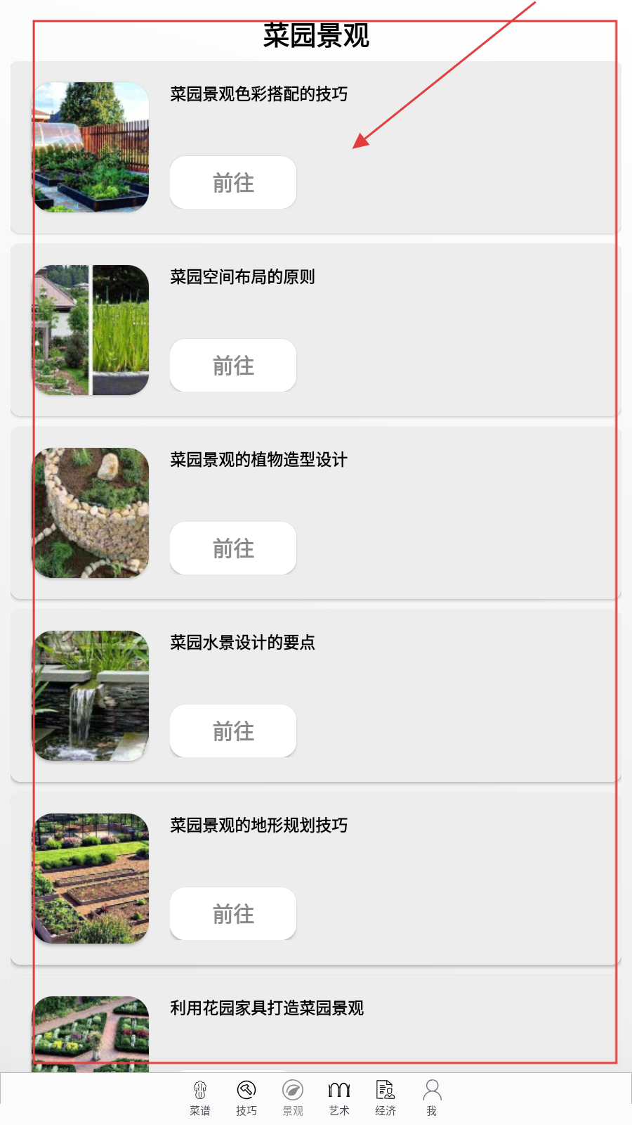4、切【景观】页,选菜园景观技巧(色彩搭配/空间布局等),点【前往】学习。