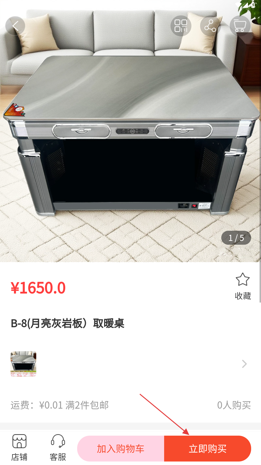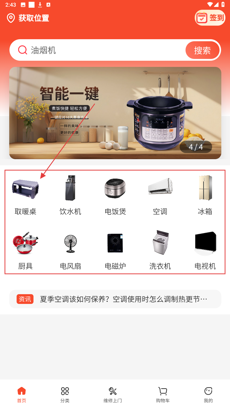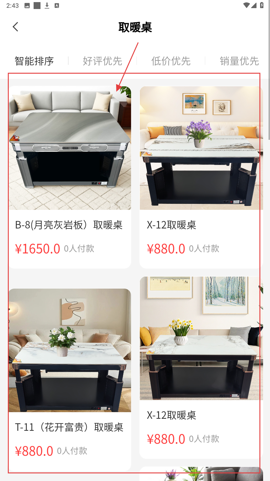 1、首页选家电品类,如【取暖桌】,进入对应分类页面。