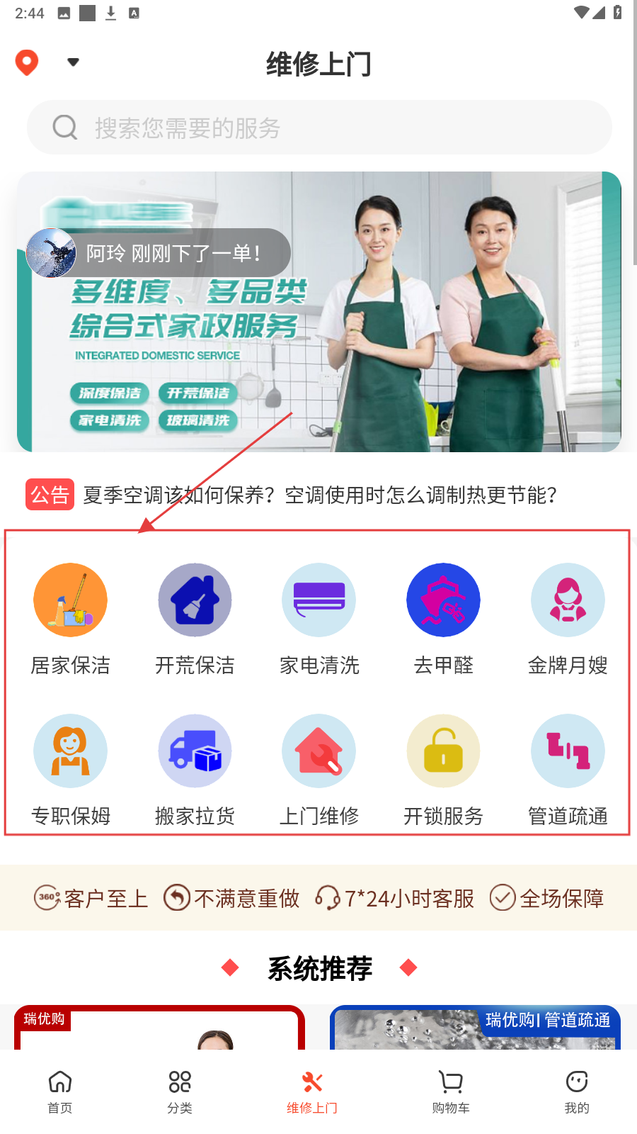 4、需家政服务,点【维修上门】,选【居家保洁】等对应服务。