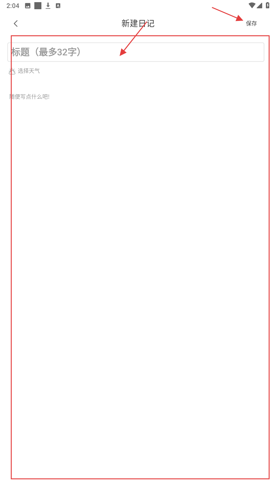 3、填标题、天气、内容,点【保存】完成日记创建。