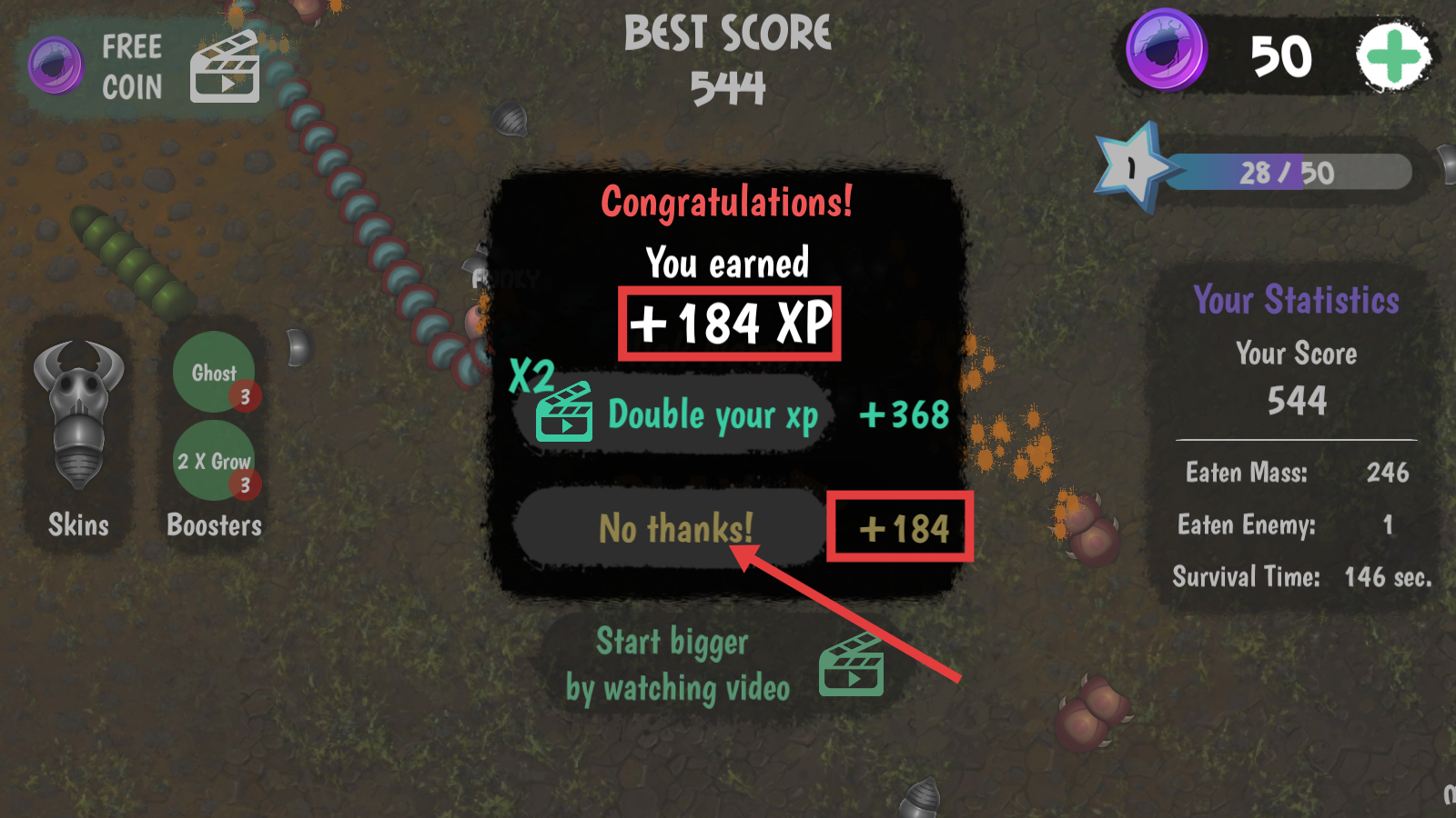4、结算时点【Nothanks!】,直接领【 184XP】,积累经验强化虫子能力。