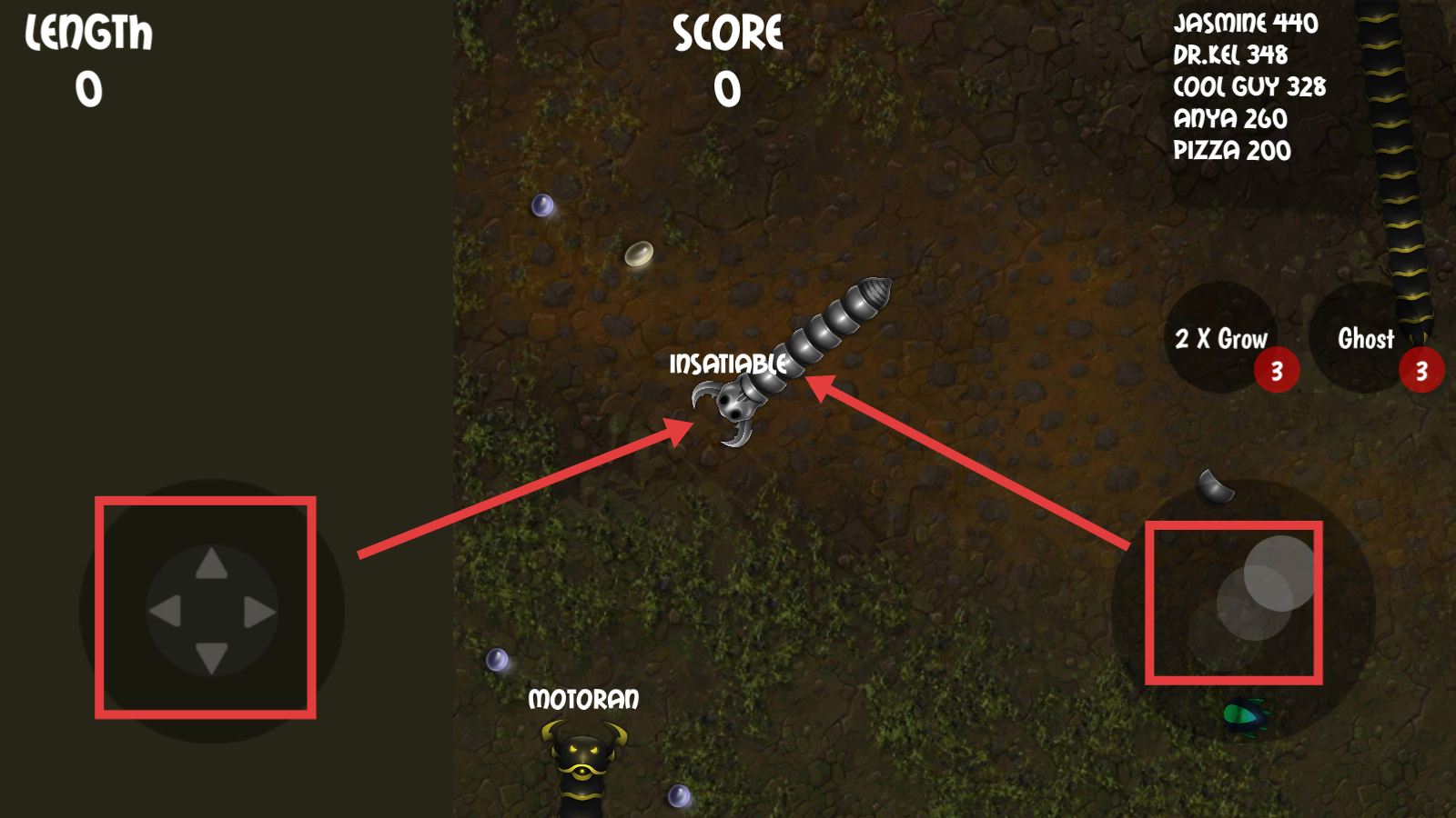 2、左侧方向键控移动,右侧按键辅助操作,优先吞食【绿色小虫】【黑色道具】,提升长度与分数。