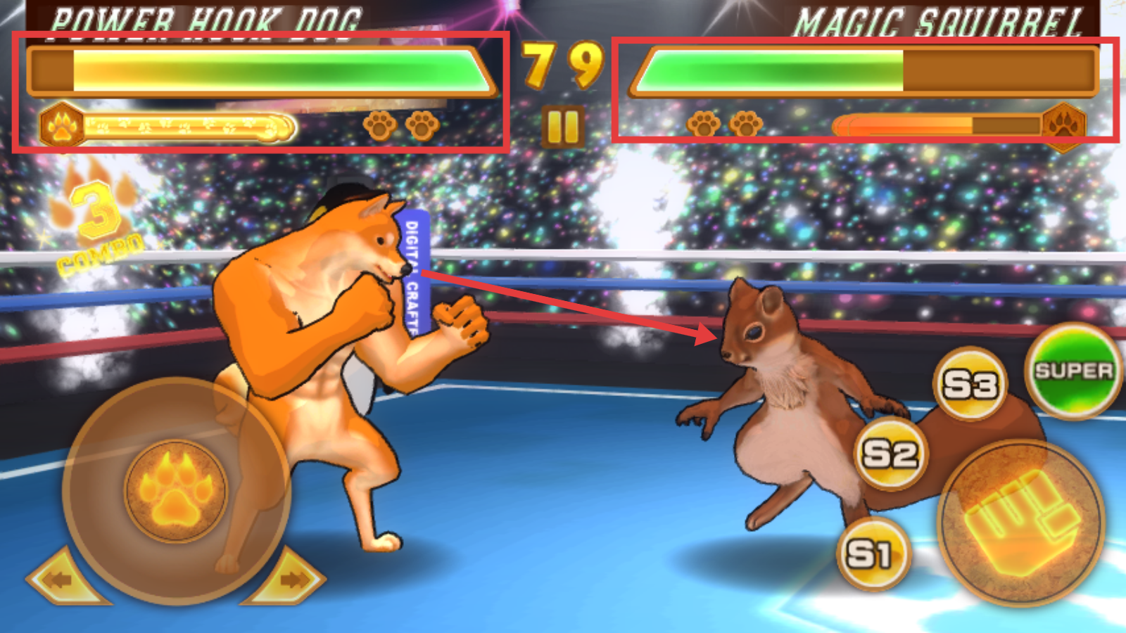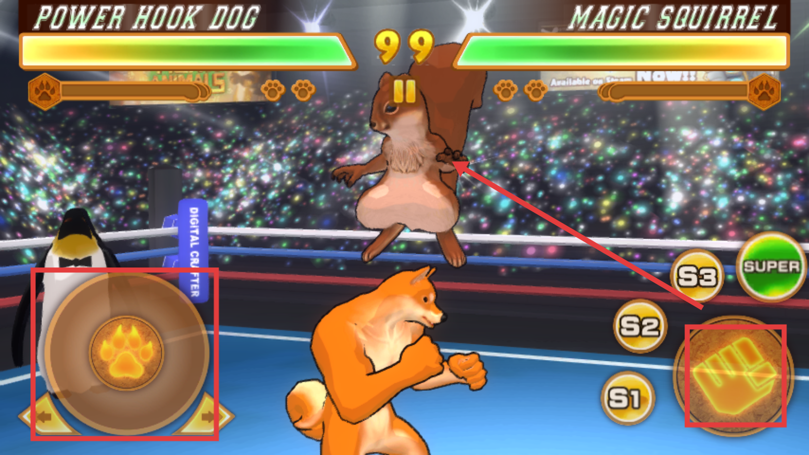 2、战斗时左侧摇杆控移动,右侧【拳头】键释放攻击,连招打击对手【MagicSquirrel】。