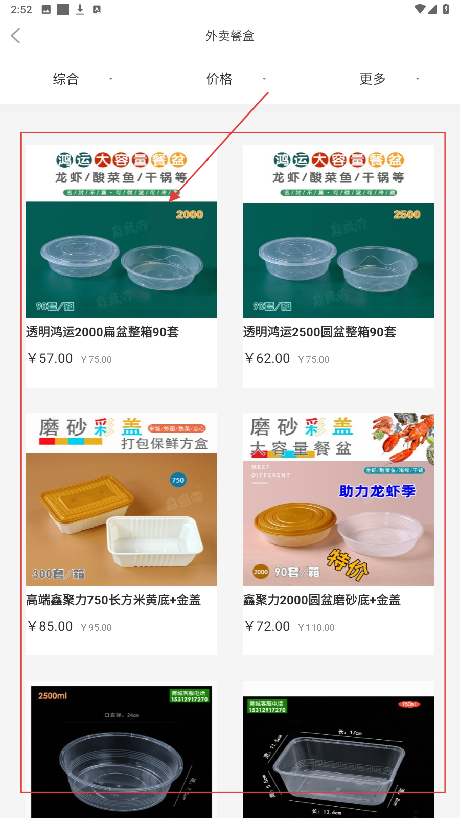 2、在【外卖餐盒】列表,挑选款式,查看如【透明鸿运2000扁盆整箱90套】详情。