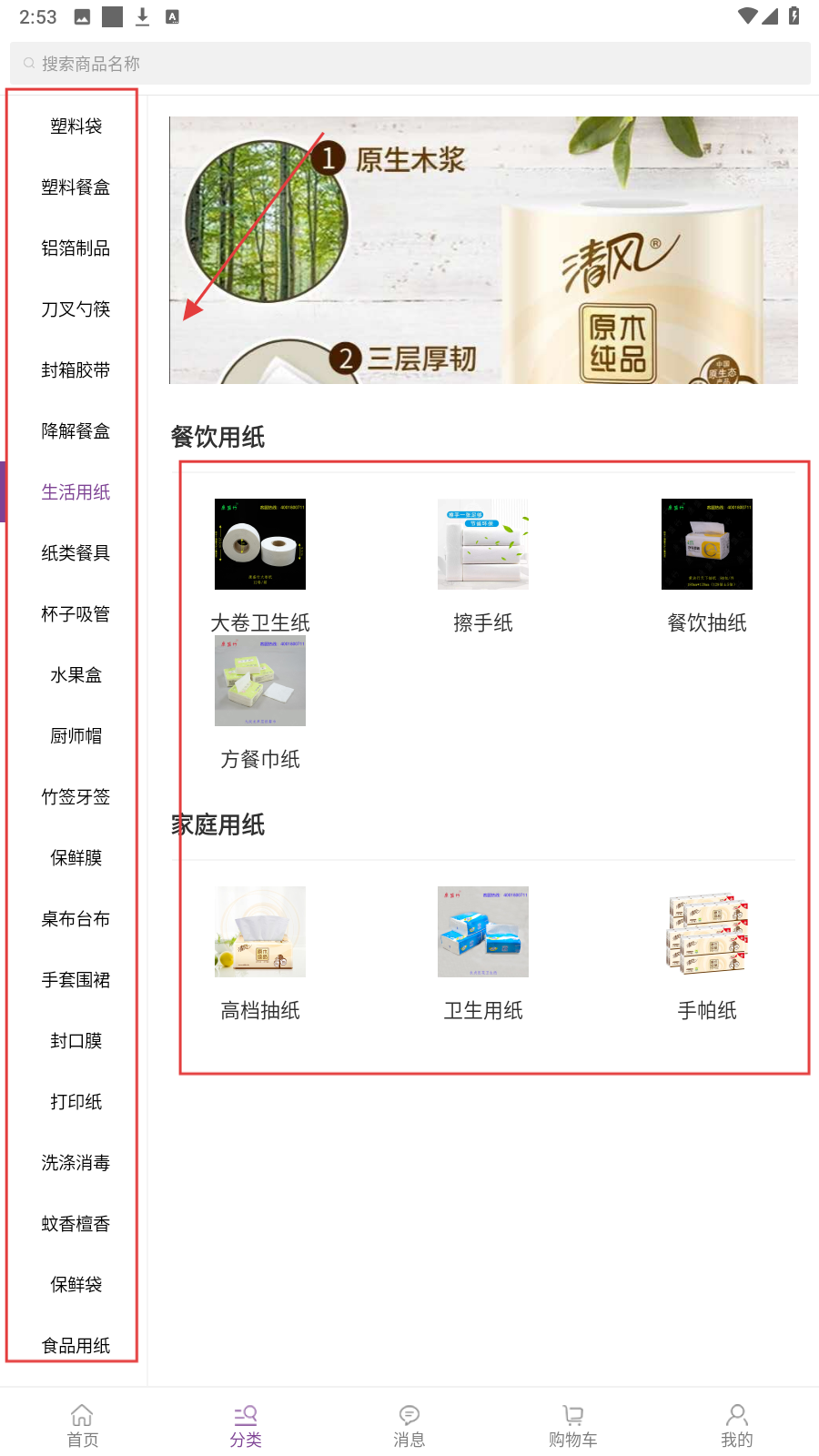 4、还可以切换至分类页,通过左侧分类栏,如【生活用纸】,快速筛选对应品类商品。
