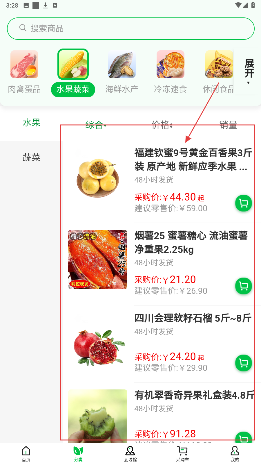 2、在分类页选如【水果蔬菜】,浏览具体水果商品列表。