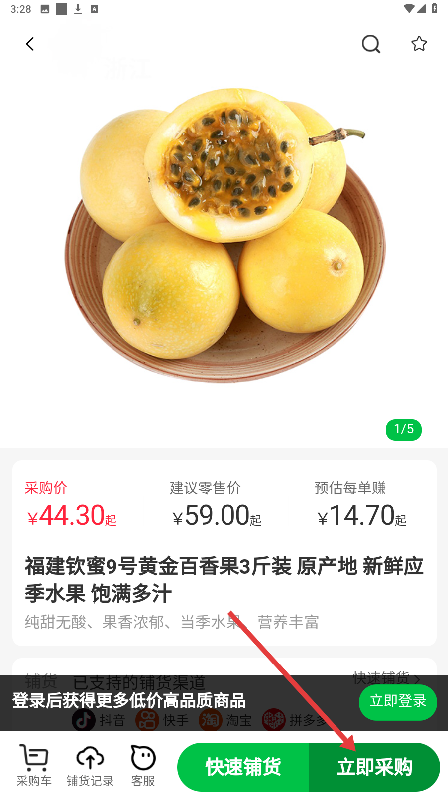 3、看中商品如【福建钦蜜9号黄金百香果3斤装】,进入详情页。