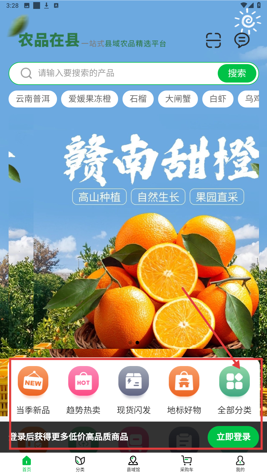 1、进入【农品在县】首页,点【全部分类】找心仪农品分类。