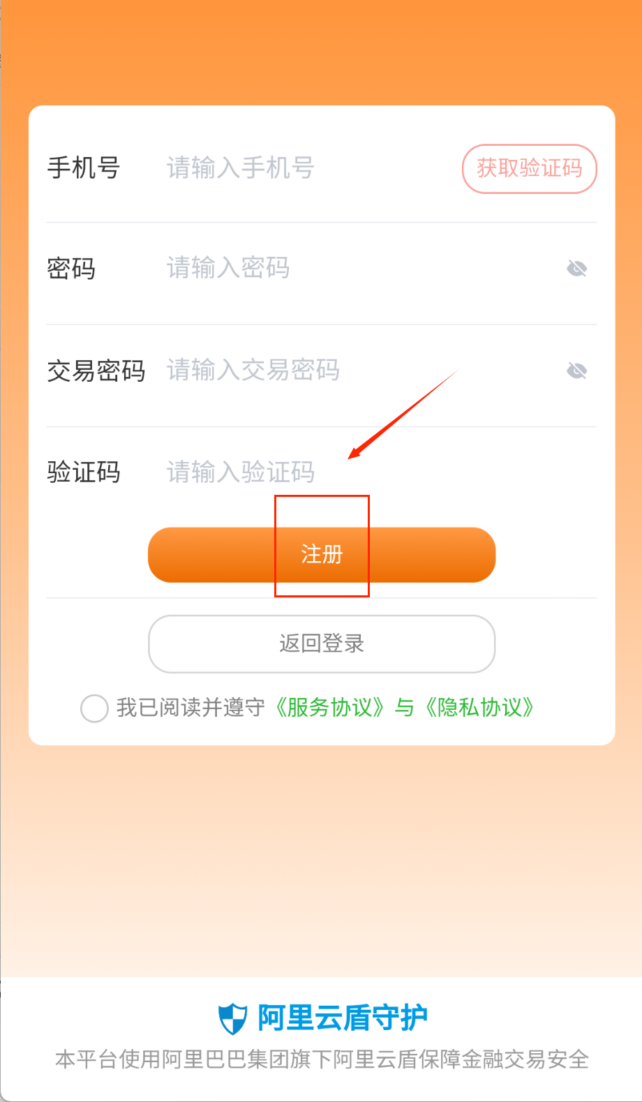 1 、注册账号很简单呢,打开软件找到注册页面,依次填好手机号、密码和交易密码,记得点获取验证码并输入。