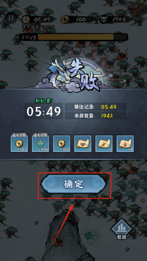 1、查看“新記录!05:49 杀敌数量:1942”,点击“确定”保存成绩并返回主界面。