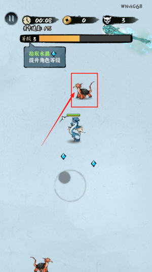 4、当屏幕出现“拾取水晶?提升角色等级”时,滑动角色触碰水晶即可升级并继续闯关。