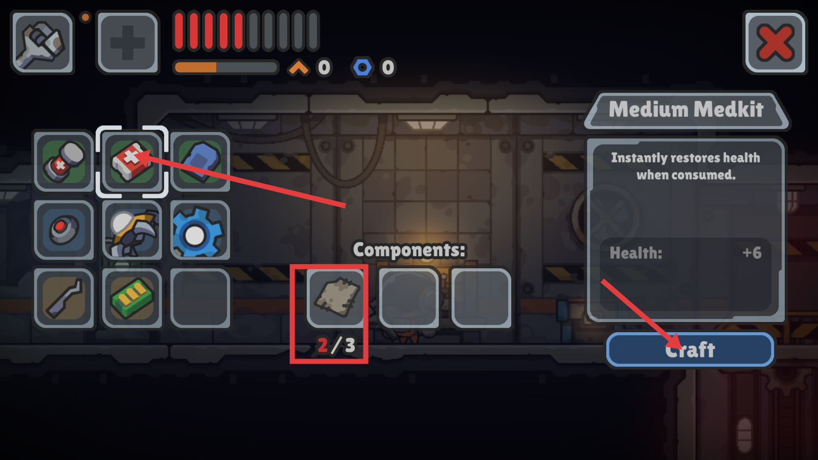 4、制作【Medium-Medkit】需3份材料,当前收集2/3,集齐后点【Craft】合成,恢复生命值。