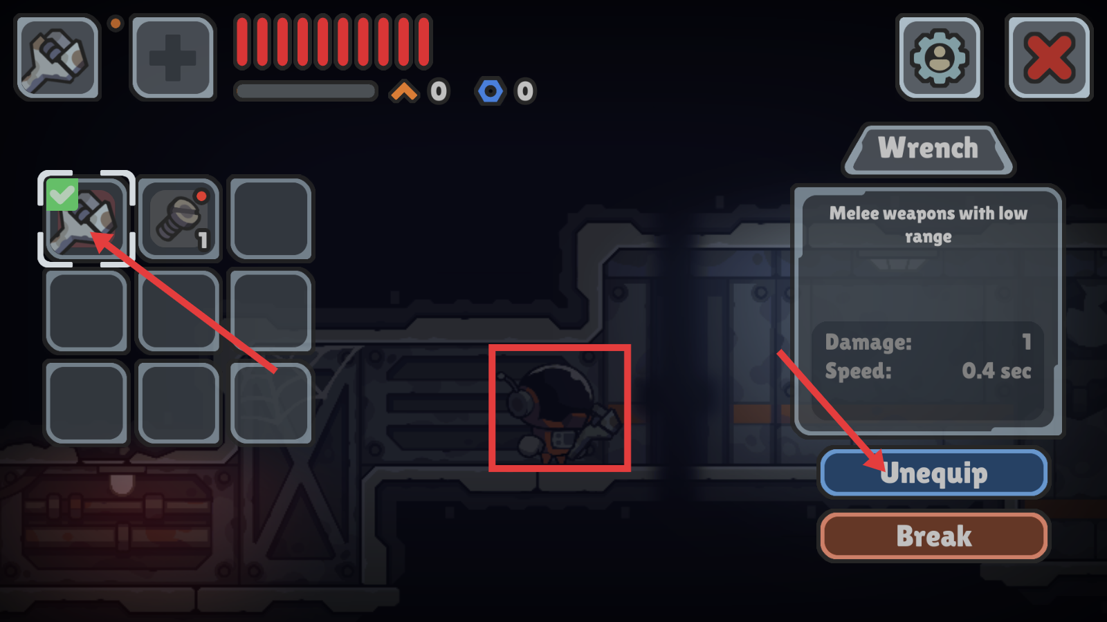 3、装备栏内【Wrench】为近战武器,若需更换,点击【Unequip】卸下,灵活搭配作战装备。