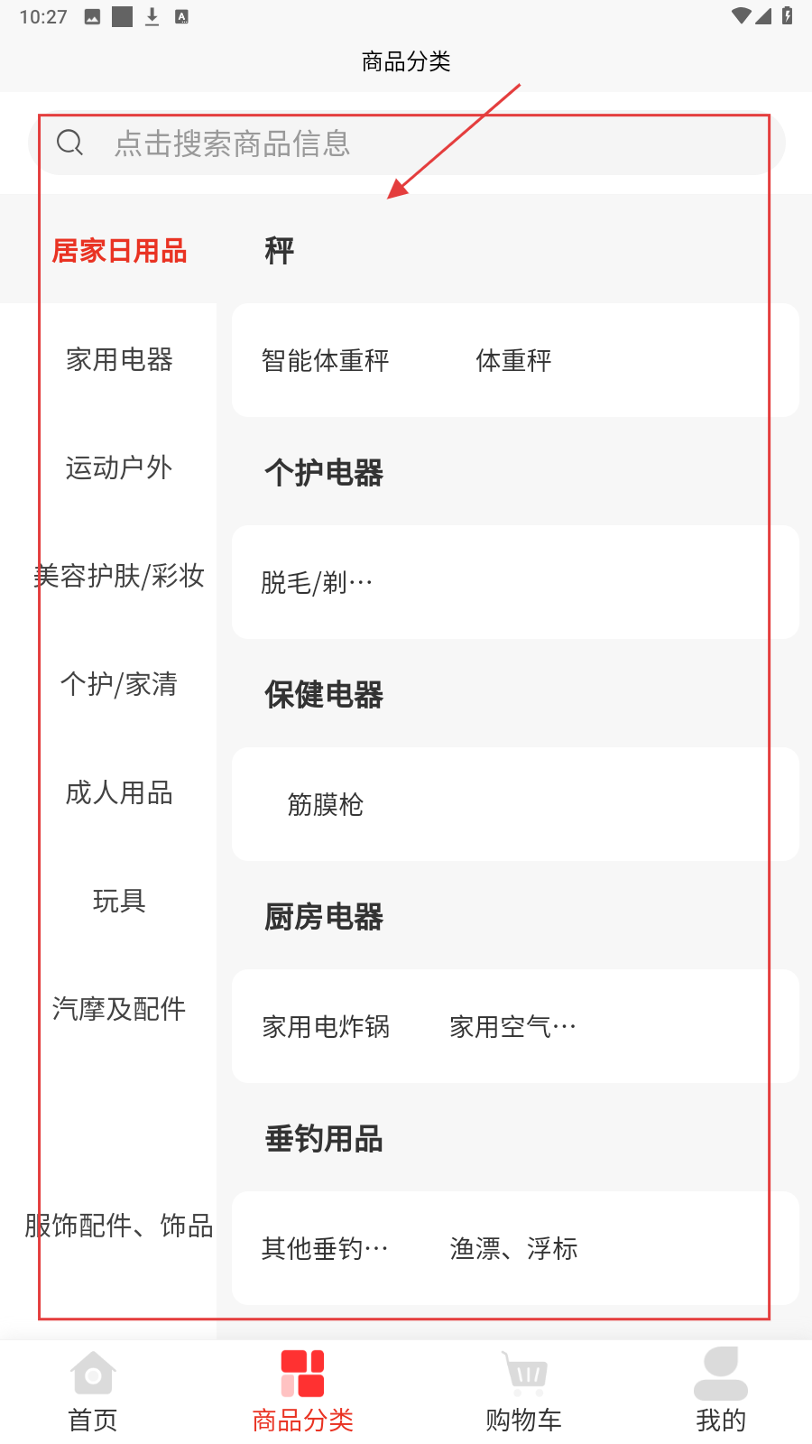 2、在商品分类页,逐层选如【居家日用品-家用电器-智能体重秤】找商品。