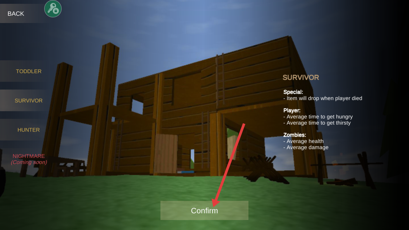 1、选择【SURVIVOR】难度,该模式角色死亡掉落物品,点击【Confirm】按钮进入游戏。