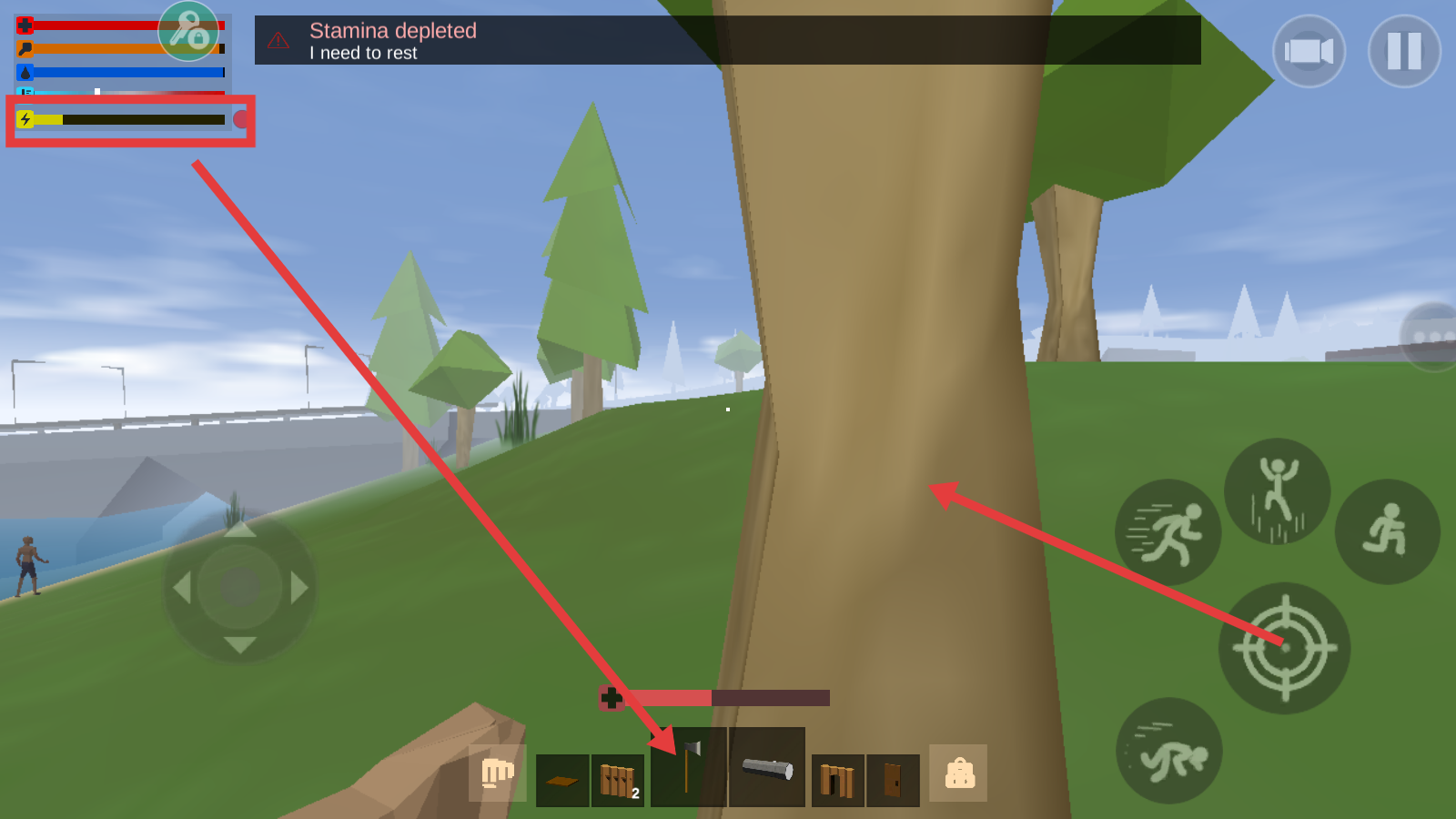 2、左上角提示【Stamina-depleted】,耐力耗尽时可切换【斧头】砍树,或停留恢复体力。